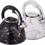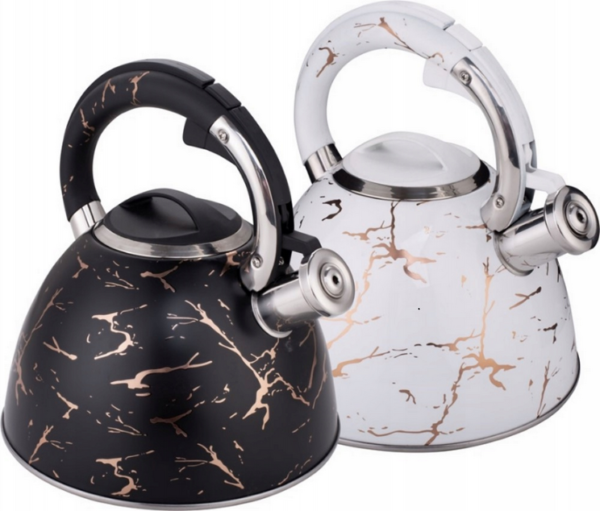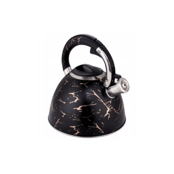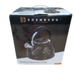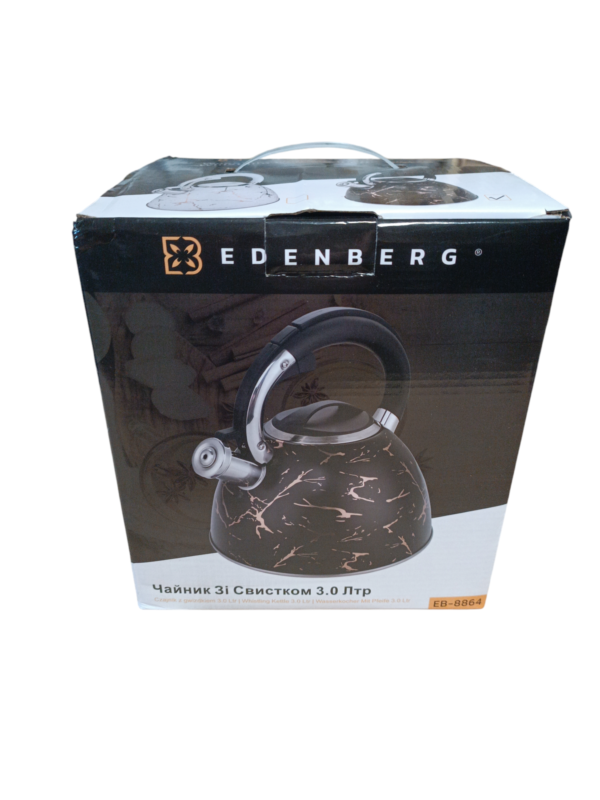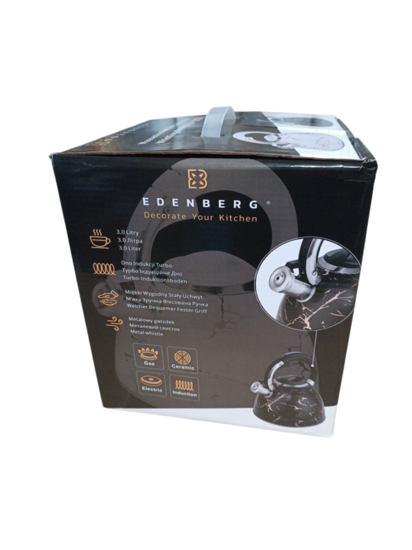 Czajnik z gwizdkiem Edenberg 8864 o pojemności 3 litrów to doskonały wybór dla osób poszukujących eleganckiego i funkcjonalnego akcesorium do kuchni. Wykonany z wysokiej jakości stali nierdzewnej w efektownym czarno-złotym wykończeniu, czajnik wyróżnia się nowoczesnym designem, który doskonale wpisuje się w trendy współczesnych wnętrz. Jest trwały oraz odporny na wysokie temperatury, zapewnia długotrwałe użytkowanie.