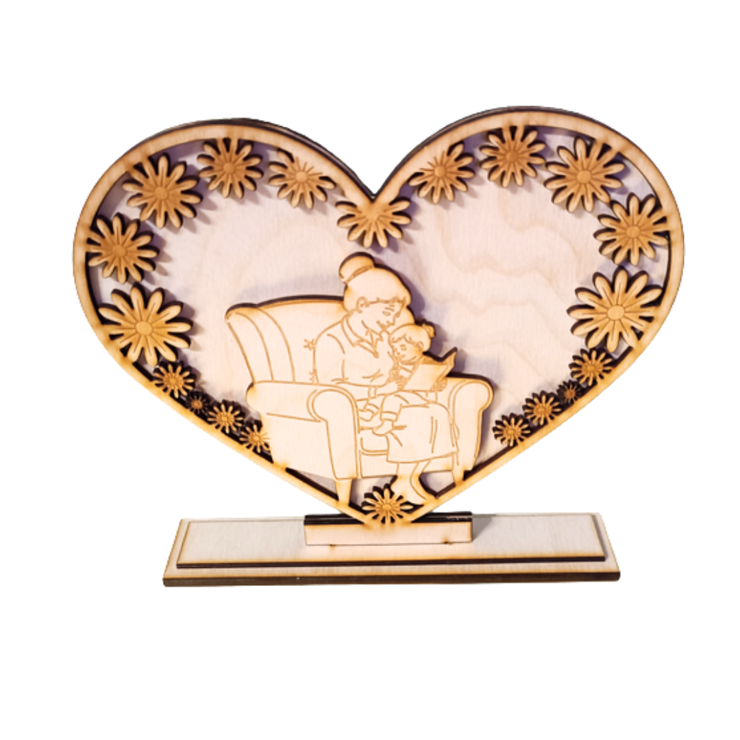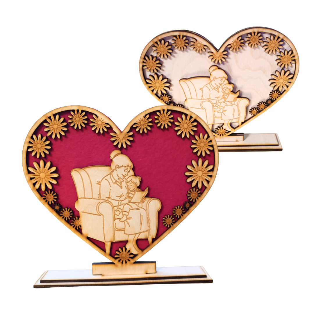 Wyjątkowa figurka w kształcie serca, wykonana z naturalnej sklejki, to piękny i wzruszający prezent na Dzień Babci. Subtelny grawer 3D przedstawiający babcię z wnukiem/wnuczką symbolizuje miłość, ciepło i rodzinne więzi. Idealna dekoracja do domu, która na długo pozostanie miłą pamiątką. Całość może być doskonałą bazą do makramy, czy półproduktem do decupage.