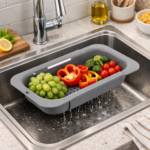Praktyczny i nowoczesny koszyk rozsuwany na zlew to idealne rozwiązanie do codziennego użytkowania w kuchni. Dzięki regulowanej szerokości doskonale dopasowuje się do różnych typów zlewów, zapewniając wygodę i funkcjonalność podczas mycia naczyń, owoców czy warzyw.