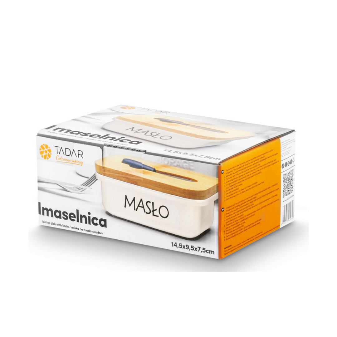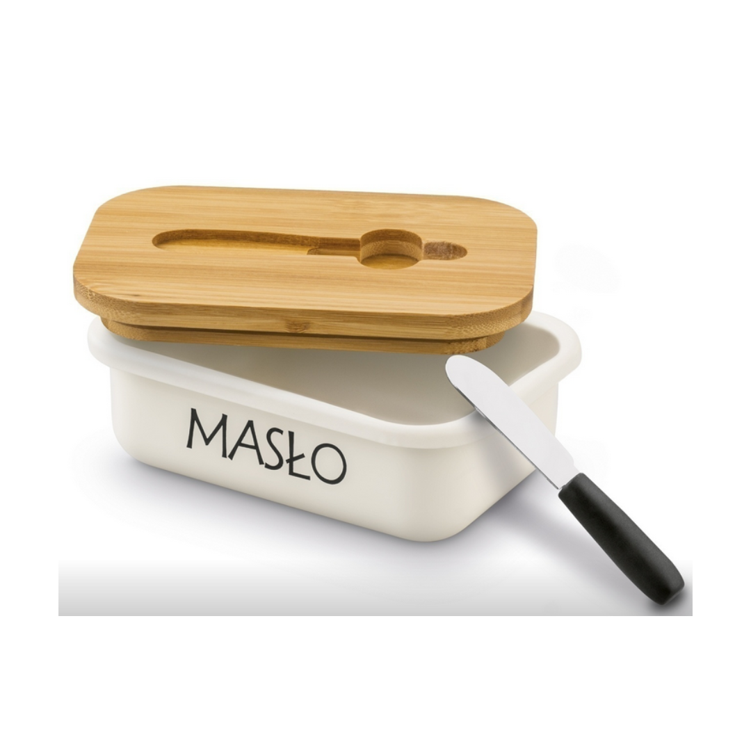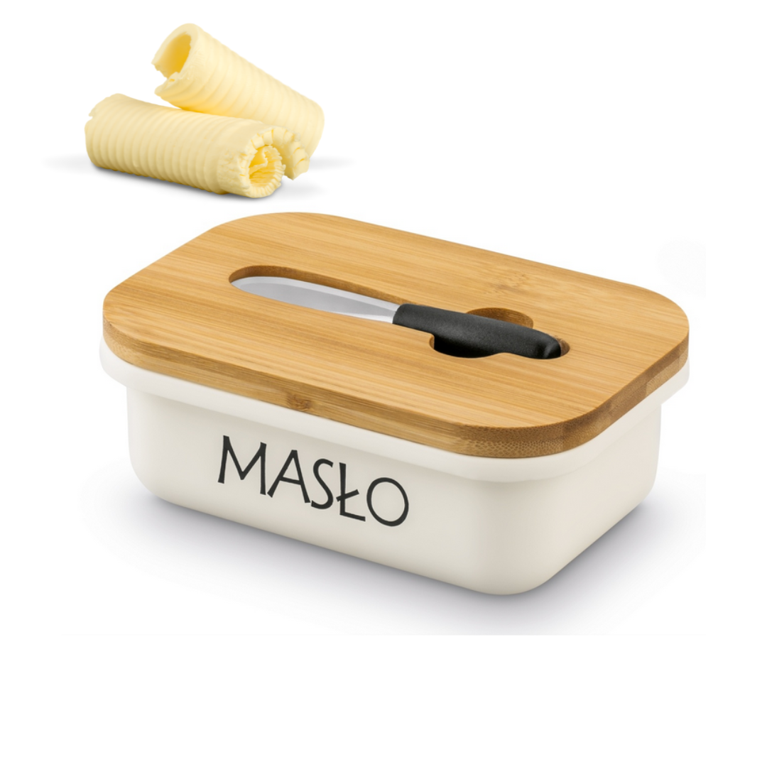 - Kompletny zestaw – w skład wchodzi maselnica z pokrywką oraz poręczny nożyk do smarowania.