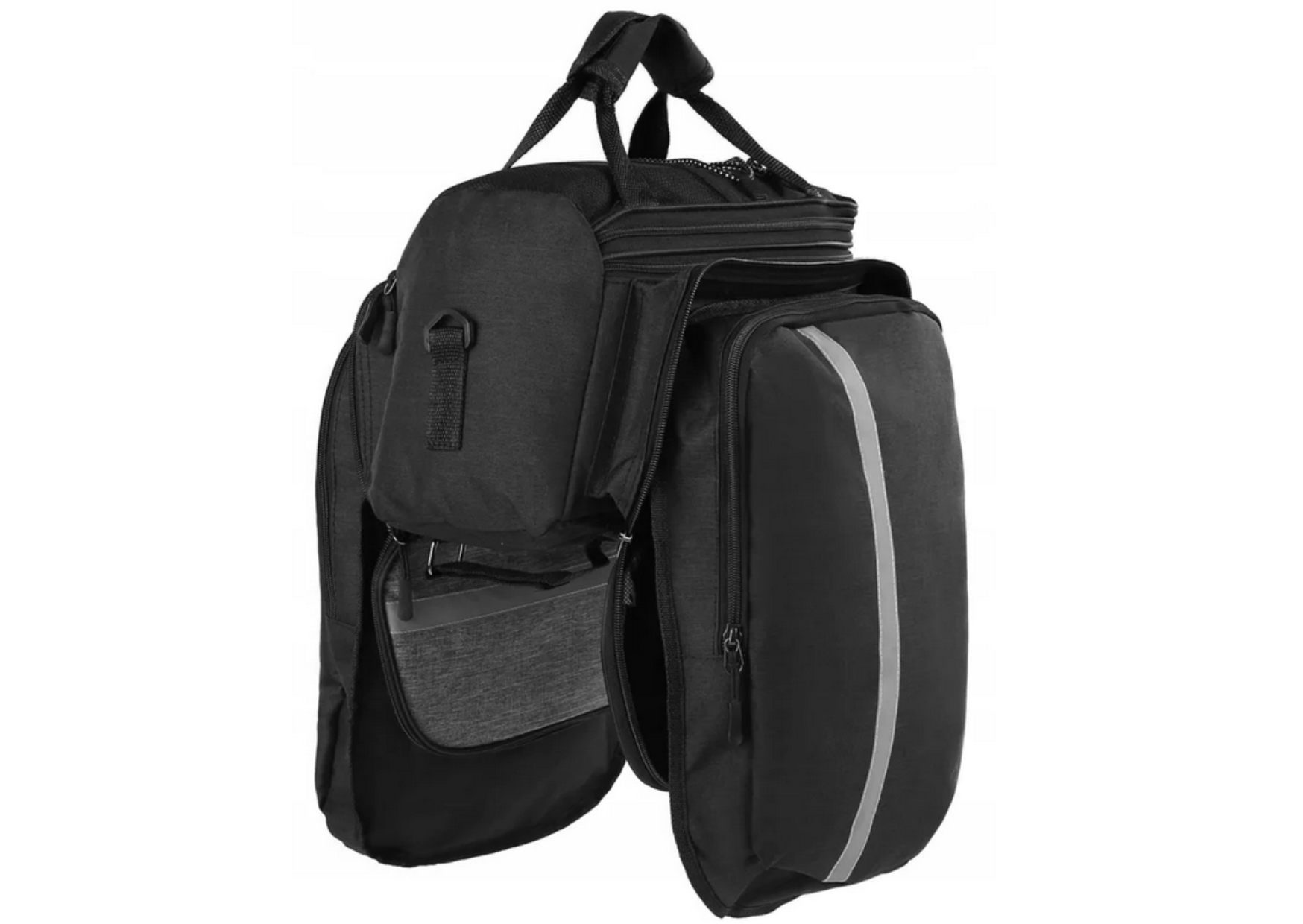 Torba została zaprojektowana w eleganckim czarnym kolorze . Posiada rozbudowane rozkładane kieszenie boczne, które można dodatkowo otworzyć np. na potrzeby schowania kurtki, bluzy, czy innych przedmiotów.  Podwójny zamek błyskawiczny oraz solidne szwy gwarantują niezawodność i długotrwałość produktu. Na górze sakwy umieszczono dodatkową gumęDo sakwy dołączony jest przeciwdeszczowy pokrowiec.