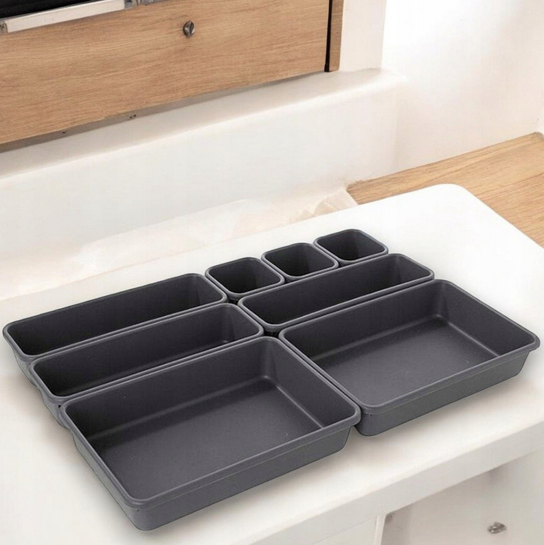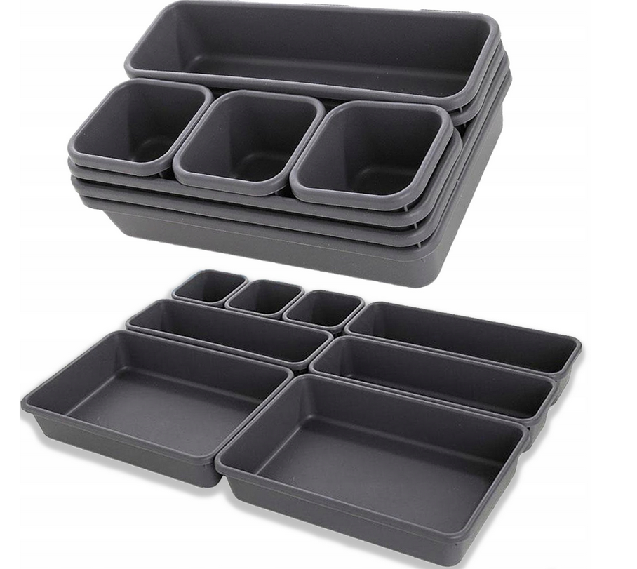 Organizer WKŁAD do szuflady składany xxl modułowy pojemnik w kolorze szarym to idealne rozwiązanie dla osób pragnących uporządkować swoje sztućce oraz inne akcesoria kuchenne. Wykonany z wysokiej jakości tworzywa sztucznego, charakteryzuje się trwałością i łatwością w utrzymaniu czystości. W skład zestawu wchodzi 8 funkcjonalnych elementów, co znacznie ułatwia segregację: 2 duże pojemniki o wymiarach 24,5 cm x 16 cm x 4,5 cm, 3 średnie pojemniki o wymiarach 24,5 cm x 7,5 cm x 4,5 cm oraz 3 małe pojemniki o wymiarach 7,5 cm x 7,5 cm x 4,5 cm. Dzięki modułowej konstrukcji organizer można dostosować do własnych potrzeb i wymagań przestrzennych szuflady. Estetyczne wykonanie oraz neutralna szara kolorystyka sprawiają, że organizer doskonale wkomponuje się w każdy styl wnętrza. Zainwestuj w porządek w swojej kuchni i ciesz się funkcjonalnością oraz estetyką, jaką oferuje ten praktyczny organizer.